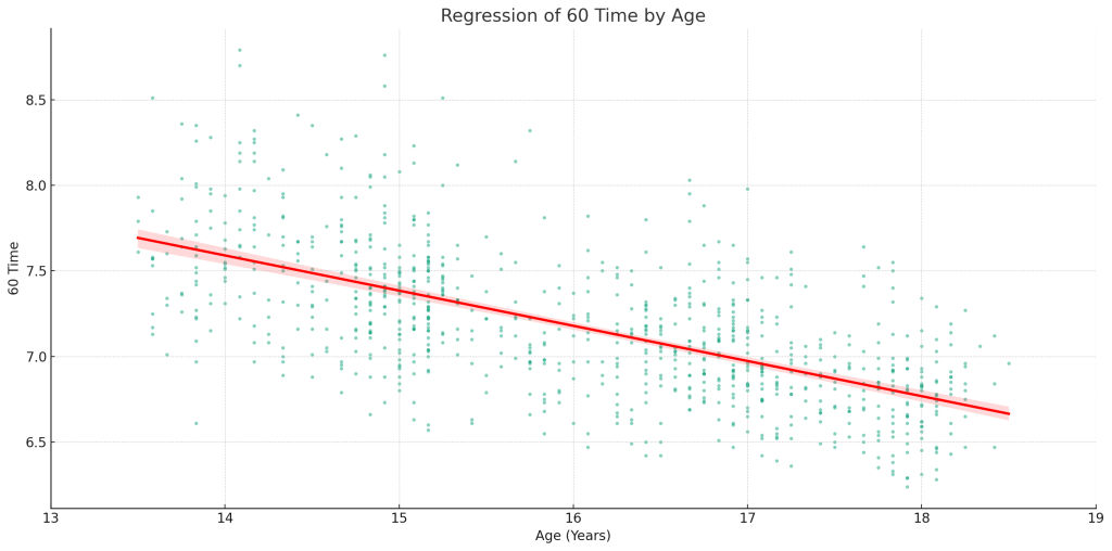 Looking at the results another way, the improvement in sprint performance in a regression gives us this view. This is more granular to age in months and shows how even a few months difference in age can impact player performance. On average, players shave off about 0.2 seconds from their 60-yard sprint each year. Interestingly, the improvement doesn’t taper off at age 18, so there appears still room for additional gains going into college or the pros.