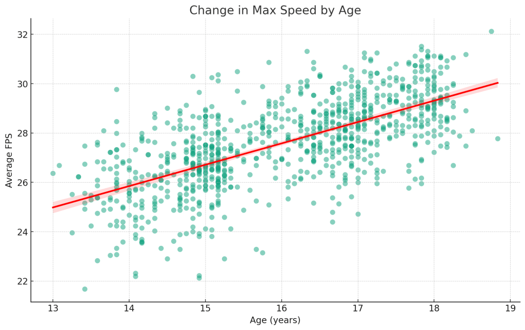 A regression analysis indicates that the average elite players typically gain a maximum speed of 0.85 ft/s, or approximately 0.6 mph, for every year of growth. I don’t have pairwise data to see what the same player runs at young age and then an older age, so take this as an estimate. Someone who’s already running over 30 fps at age 15 won’t see that level of gain every year. On the flip side, the slower kids at ages 13 though 16 either get faster or opt out of the sport (or at least opt out of the showcase test) because there’s no one who ran under 24 fps after age 16.