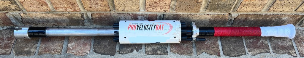 ProVelocity Bat is an ingenious hitting training tool that is designed to increase bat velocity and improve swing path. The product is a “bat” that has a plastic cylinder that slides up and down the barrel based on how fast a player swings. The ProVelocity cylinder is connected to the neck of the bat by several bands of various thicknesses that create resistance. The more bands that are used the more difficult it is to get the cylinder to slide. The goal is to find the optimal resistance to slide the cylinder at the point of contact. Too early and there’s not enough resistance; too late and there’s too much.