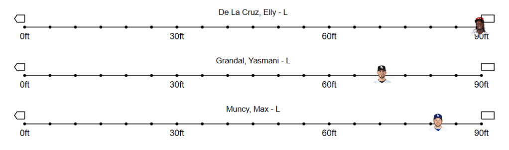 As you can see the, the one second time difference between De La Cruz and Grandal translates into almost 20 feet on the bases. There are some differences between times of left-handed and right-handed hitters, which are excluded to keep this simple.