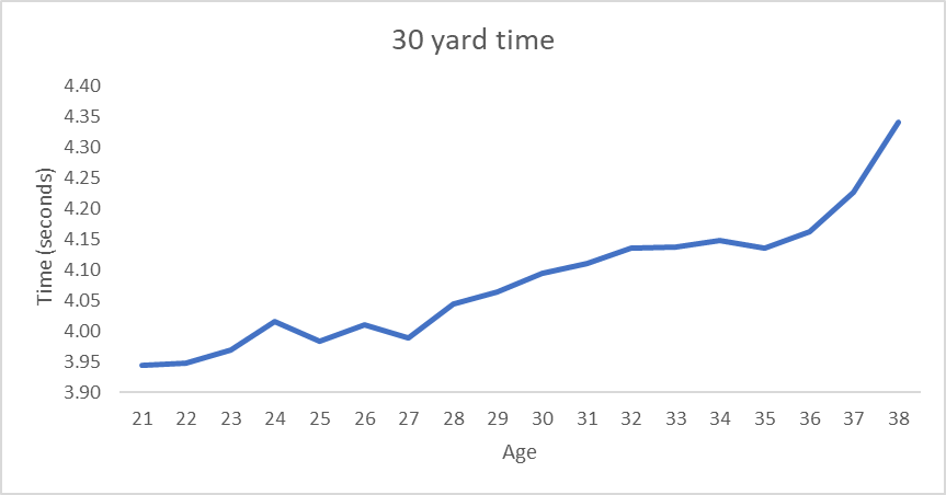 It should come as no surprise, but as players age, they slow down. A 22-year-old player’s average is sub 4.0 at 3.95 seconds, which then slowly creeps up to over 4.25 fifteen years later. As you can see below, speed is pretty stable until age 27 and then it begins to slow rapidly through age 36 after which it just falls off a cliff. There is some survivorship bias in this because the few players that remain after age 30 are likely the best athletes of the group.
