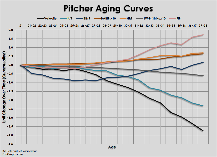 Pitchers also experience their prime between ages 27 and 29, with varying metrics reaching optimal levels during this period. Walk rate is lowest at 25-27, BABIP is best between 20-22, home run rate hits its lowest point from 20-26, and strikeout rates peak between 22-28. Fastball velocity reaches its apex at ages 20-21 before experiencing a gradual decline. A different Fangraphs article about pitchers shows less pronounced declines than I described and are captured in the chart below. The article also breaks out starting pitchers from relief pitchers.