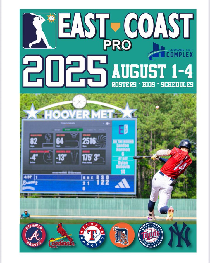 East Coast Pro (ECP) is widely regarded as the most important professional scouting event of the summer travel baseball season for rising high school seniors. As the name suggests, it features top talent from the eastern half of the United States, with approximately 175 players selected to compete on one of six regional teams. Players must be nominated by scouts and tryout in a regional location to be named to the team. The tryout includes running a 60, I/O, BP and pitchers facing about four hitters and hitters getting a couple fo at bats. While often compared to its peer event, the Area Code Games, ECP is typically held in even higher esteem by scouts and player development staff. The event takes place during the first week of August at the Hoover Met Stadium in Hoover, Alabama.